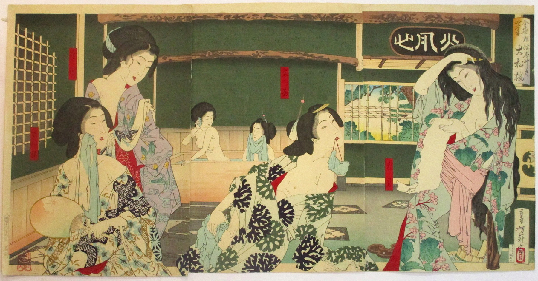 Title: The heights of the four seasons Summer women bathing at the Daishoro. the fliwer mansion in Nezu men bathing at the Daishoro